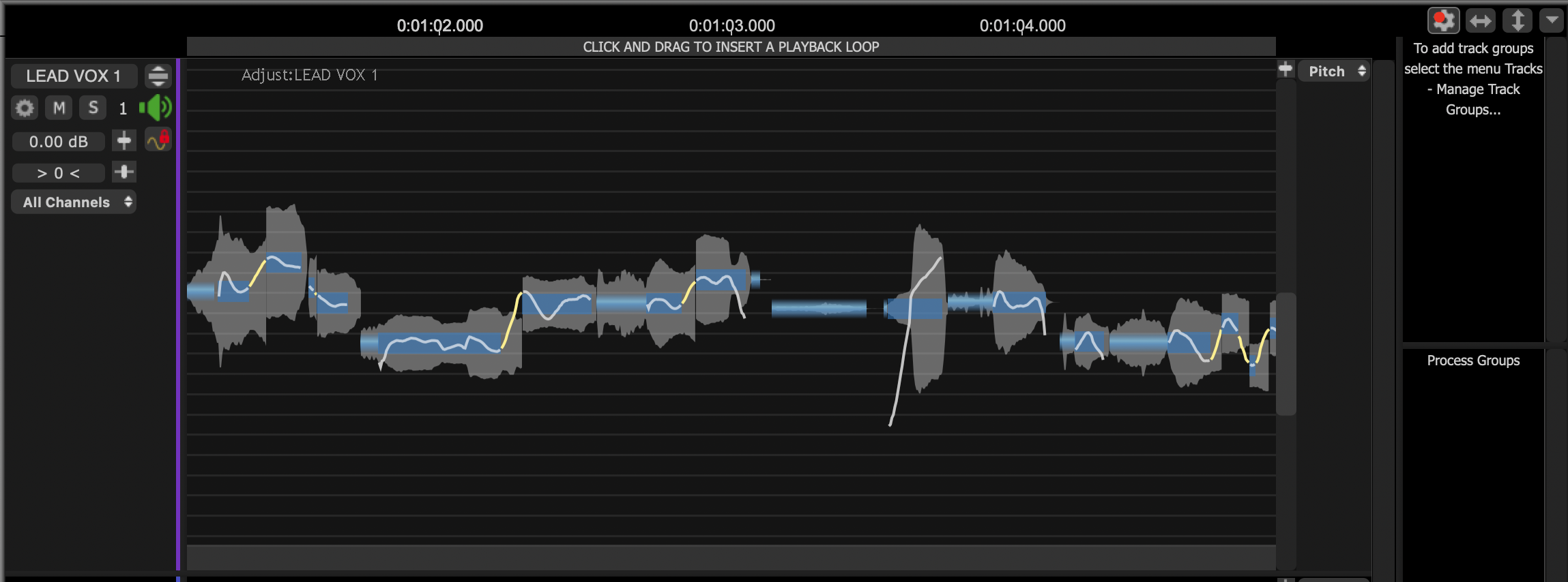 We are now able to directly adjust the time, pitch, and level of the audio region. The controls for doing so are described throughout the rest of this section. In the below image, we have zoomed in on the Lead Vox 1 track to better see the result of selecting 'Adjust Time / Pitch / Level'.