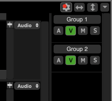 If a track is in more than one group, the vertical bar on the left of the track controls will be split between the colours of the different groups to which it is assigned. Here Audio 3 is assigned to both red and green groups: