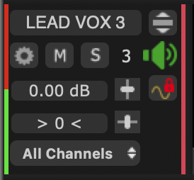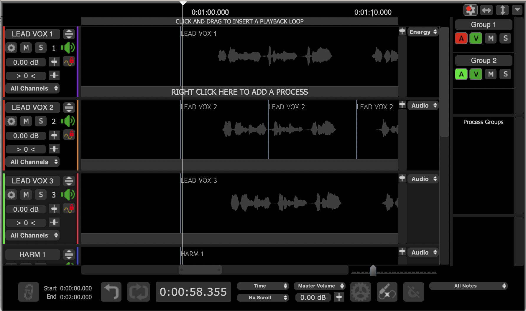 When you activate a group by pressing A in that group's controls, the button lights up with the colour of the group (the colour is selected in the Manage Groups function described at the start of this section), and (as long as they are visible) the tracks in that group show a vertical bar of that colour down the left side of the Revoice Pro window. In this example, Group 1 is red and affects the first two tracks, while Group 2 is green and affects track 3.