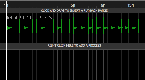 In the picture below you will see the bar/beat grid of the imported MIDI file against an audio click track that conforms to the same pattern. The tempo varies from 100 to 160 BPM up to bar 13.