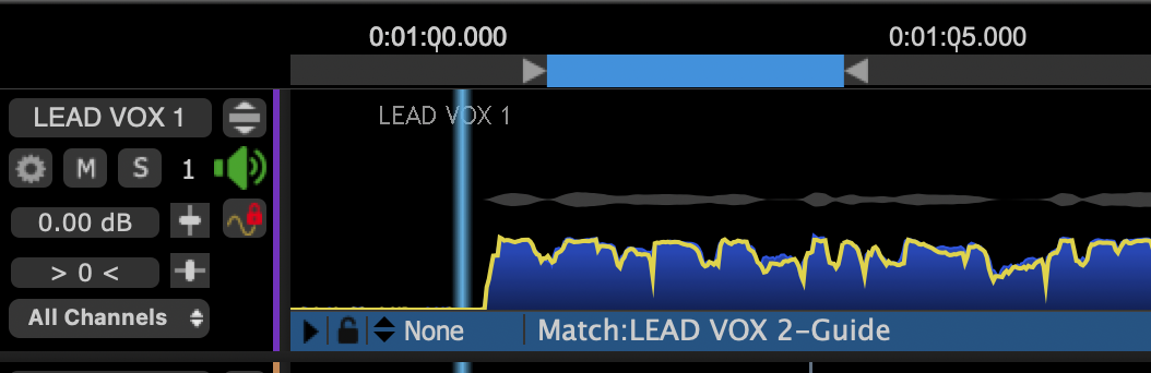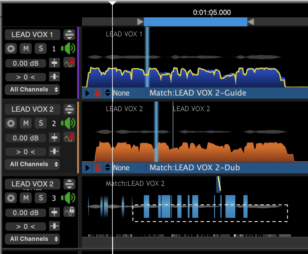 A Playback Range can also be inserted by highlighting a group of notes or pitch blocks in Adjust or Match output displays and pressing the Y key on the computer keyboard.