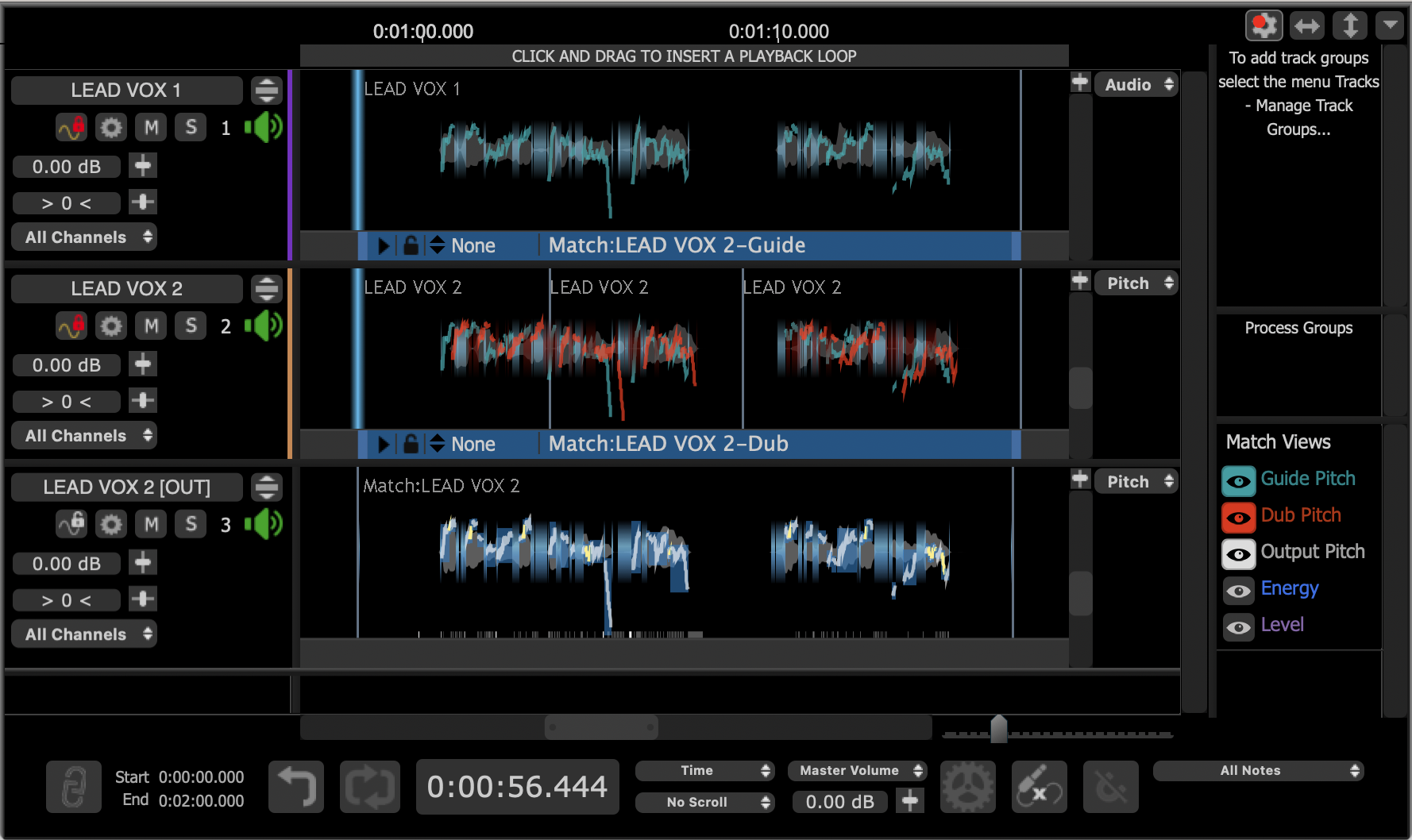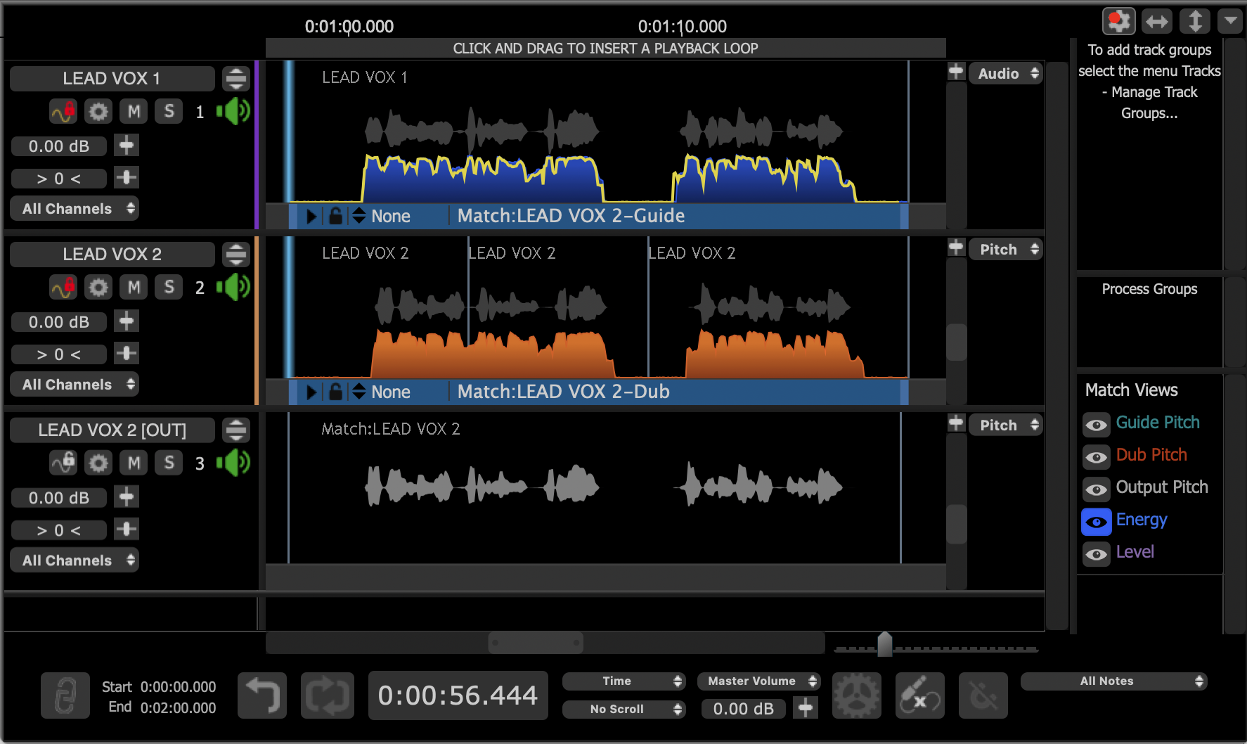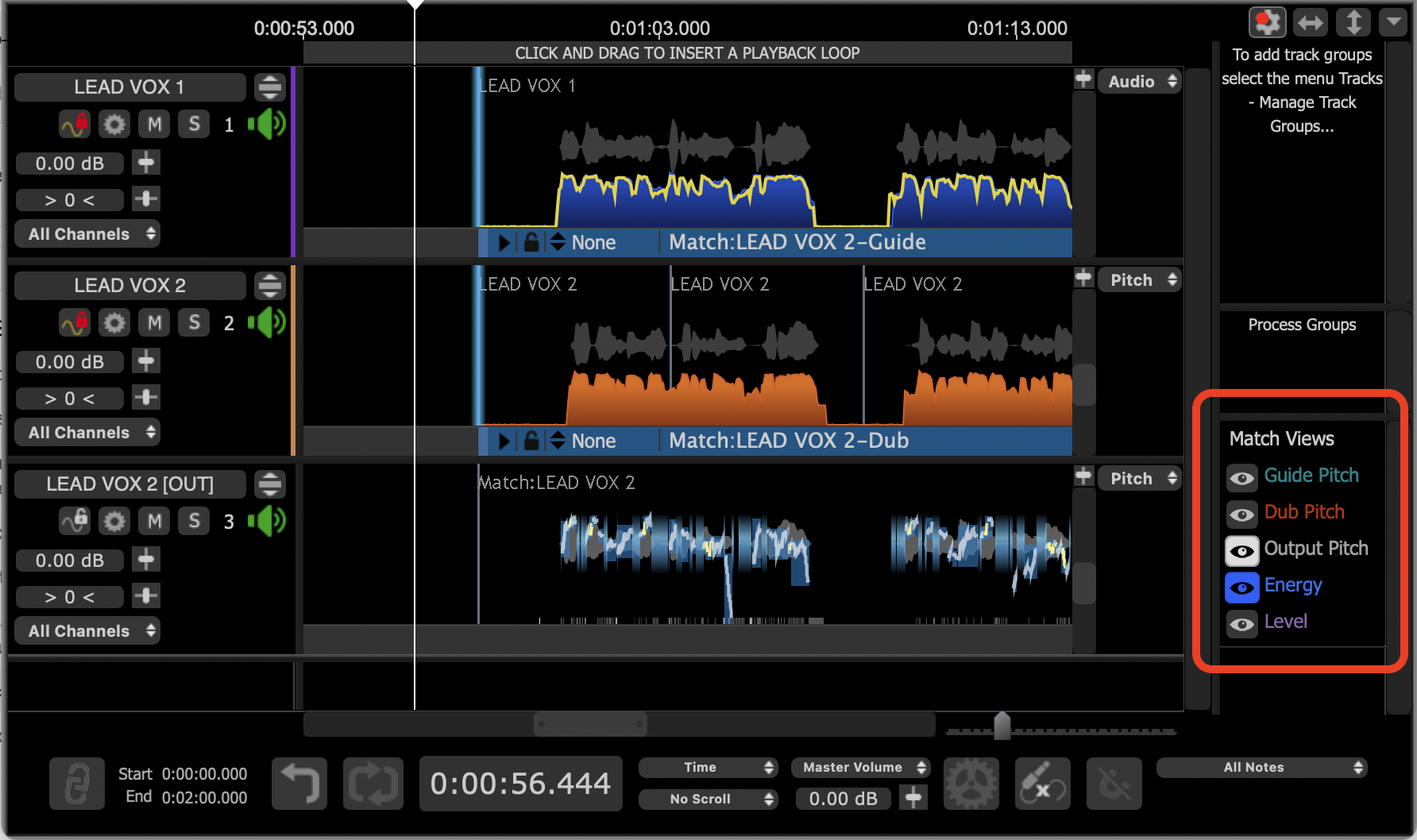 The Match process contains a large amount of information that can be shown in each track as audio, energy, pitch and level. Moreover, what is shown in each track depends on the role of the audio in the Match process, i.e. whether the track holds the Guide, Dub or Output.