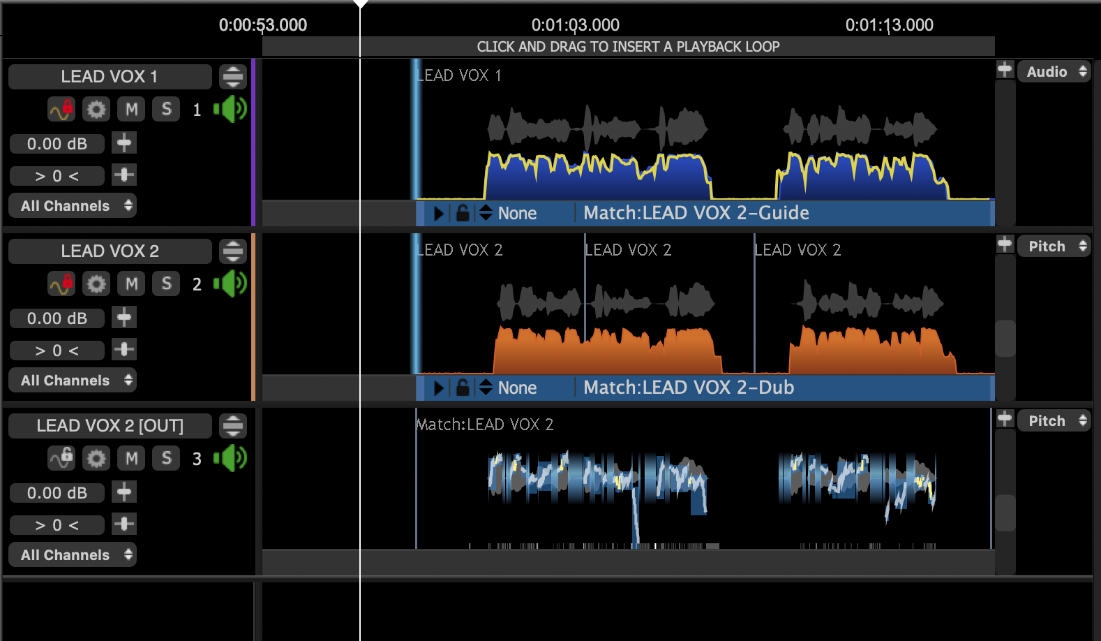 In the track named LEAD VOX 2 [OUT], the light grey shows the output audio waveform, and the various lighter blocks and lines show the time-adjusted output measurements from the pitch measurement system.