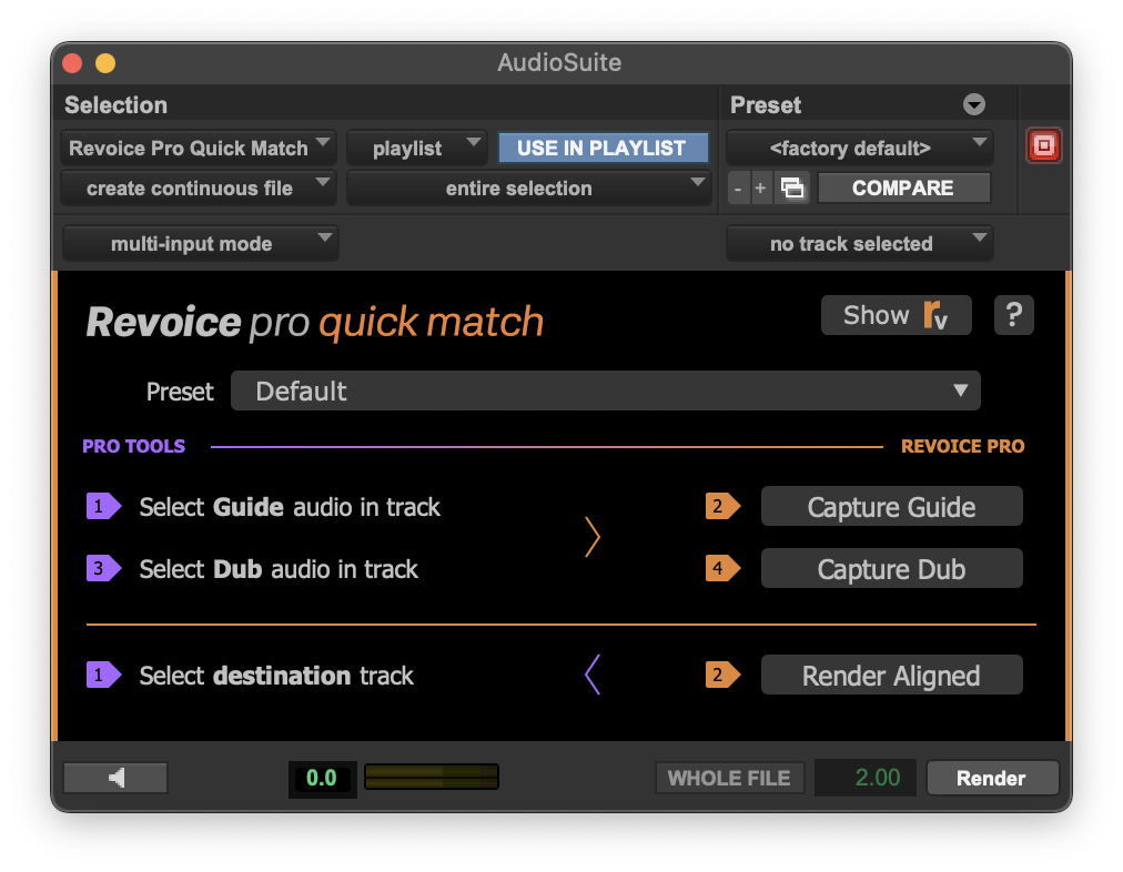 The Pro Tools "Quick" AudioSuite plug-ins can be used to apply a single Revoice Pro (RVP) process (Match or Doubler) to selected audio, and return the processed result to Pro Tools (PT).