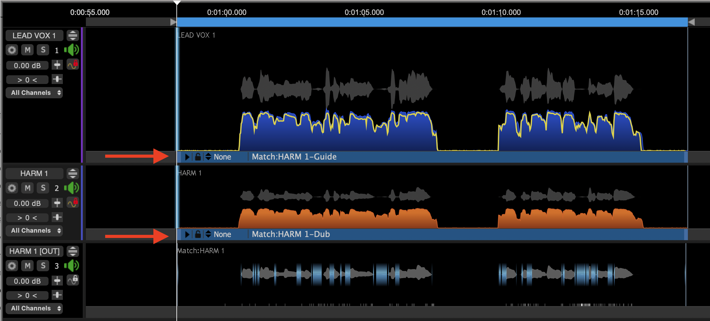 In the below image, we've applied a Match process to LEAD VOX 1. We used LEAD VOX 1 as the Guide, and HARM 1 as the Dub. The Guide and Dub tracks now each have a Process Control Block (indicated by the red arrows) on their respective Process Control Tracks.
