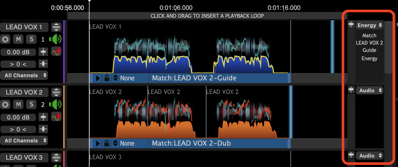 Revoice Pro has a display in the session window's right hand border which shows what is currently editable in the tracks related to a selected Process or waveform. This is particularly useful as more tracks get added to a session, as in the image below.