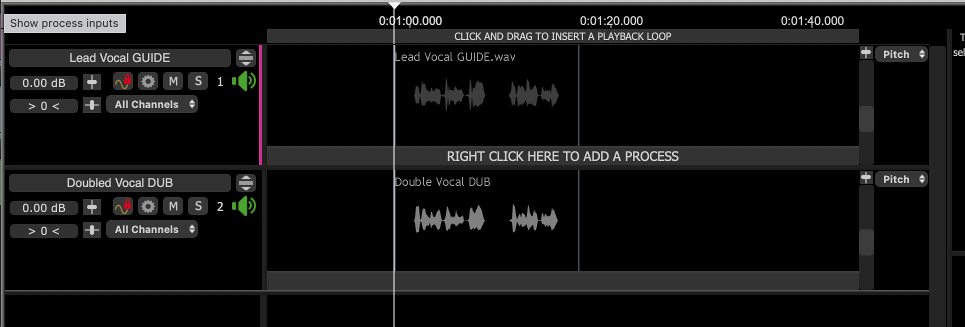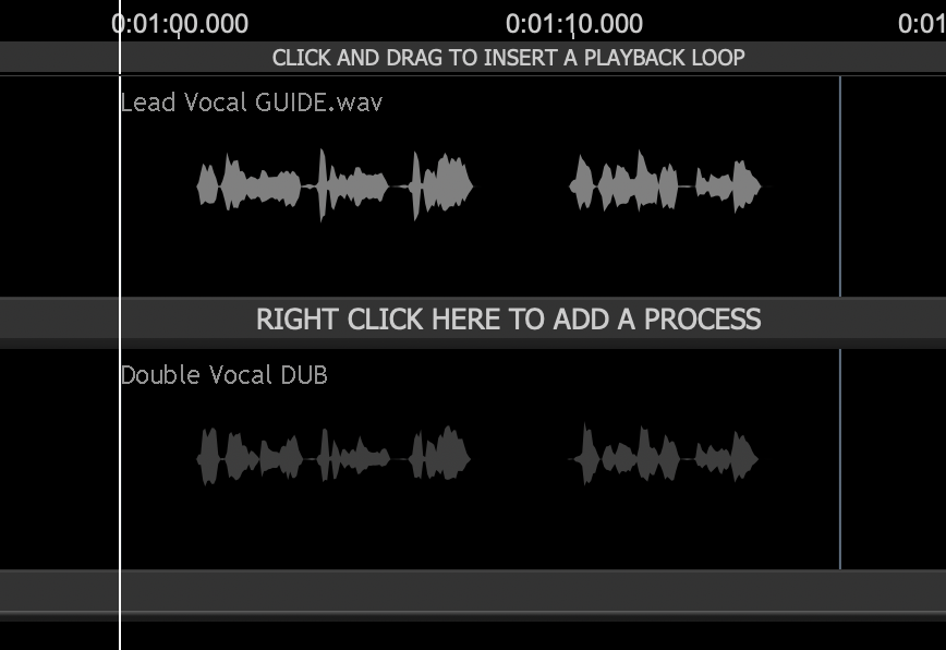 In this example we are going to use a Match (see Match Process for more details) to align the Dub signal (Double Vocal DUB) to the Guide signal (Lead Vocal GUIDE).