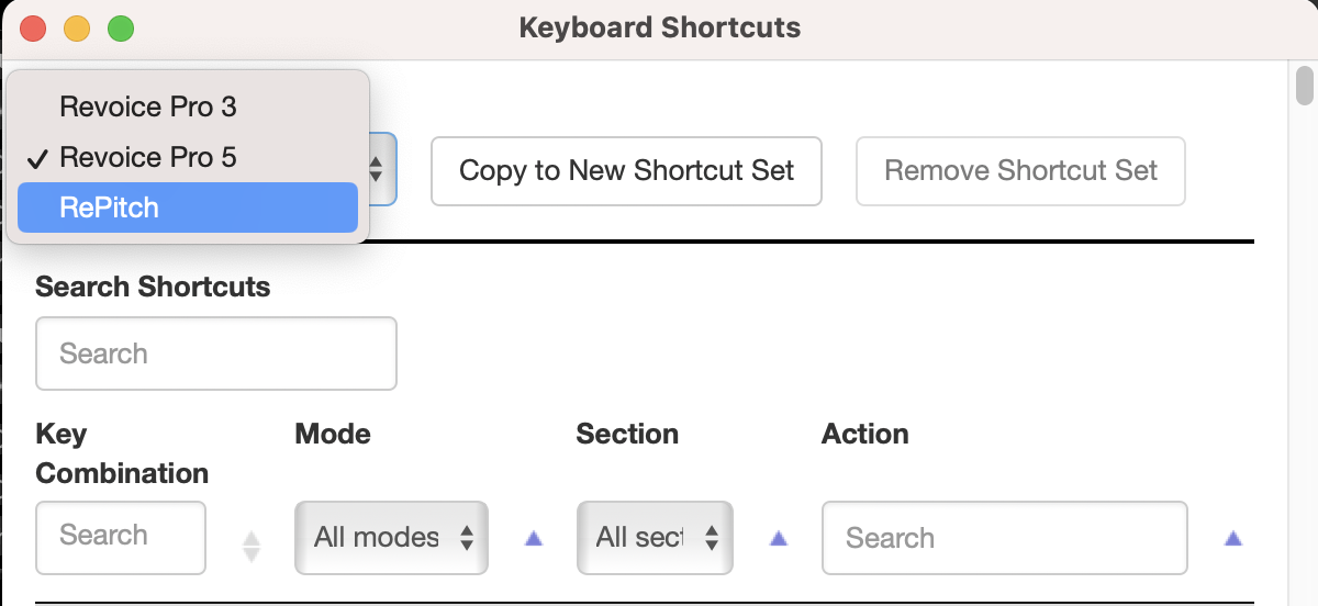 The Repitch keyboard shortcut set can be accessed in the Keyboard Shortcuts menu by clicking the dropdown menu in the top left.