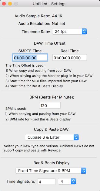 Make sure you check in the Revoice Pro View > Settings window (shown right), that Revoice Pro's DAW Timecode Offset / SMPTE Time is set to the same Offset as the Logic Pro File > Project Settings > Synchronization... options. Logic normally sets this by default to 1 hour, which we also do in Revoice Pro. The Time display will show the actual corresponding running time, based on the Timecode Rate.