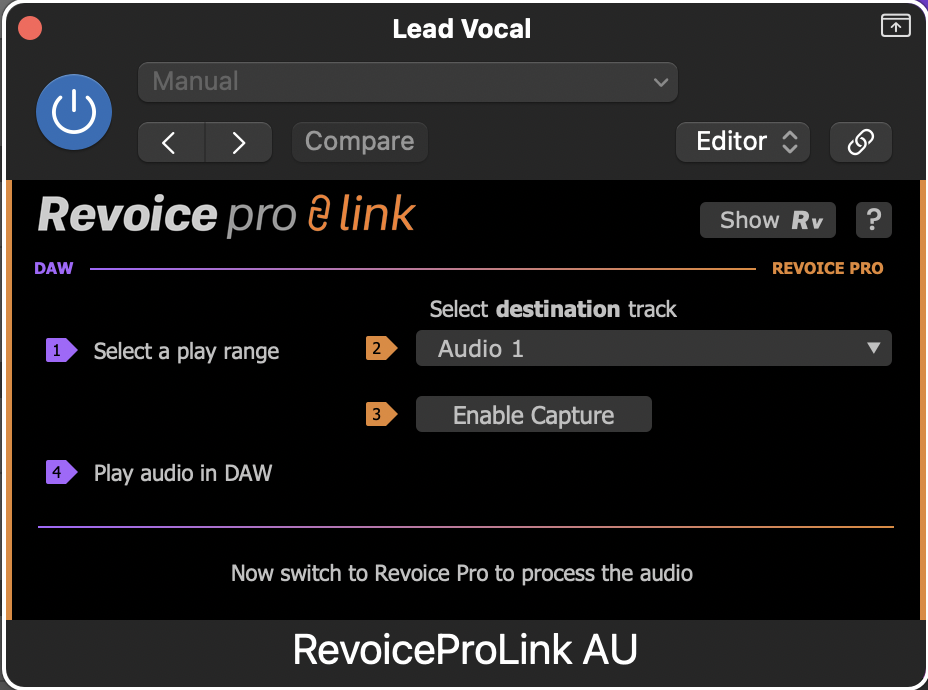 On each Logic track to be processed by RVP, insert the RevoiceProLink AU plug-in (it does not have to be the first in the list, but any plug-ins before it will have an effect on audio transferred to RVP):