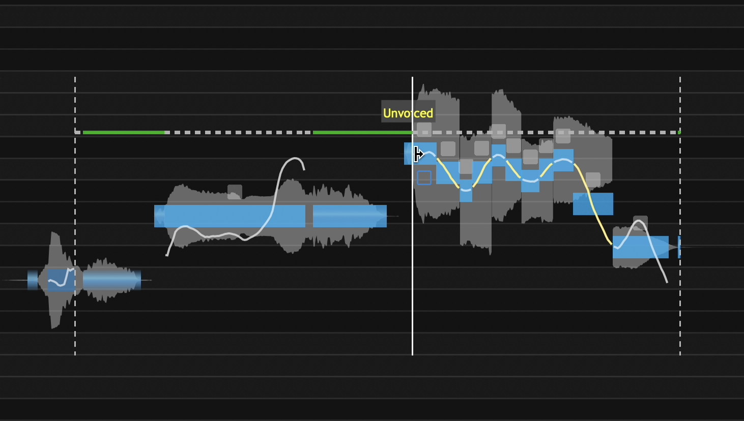 By dragging left, note blocks to the left of the solid vertical line have been compressed, and to the right have been stretch. Sibilant sounds are still marked by green lines, and have been moved rather than warped. |