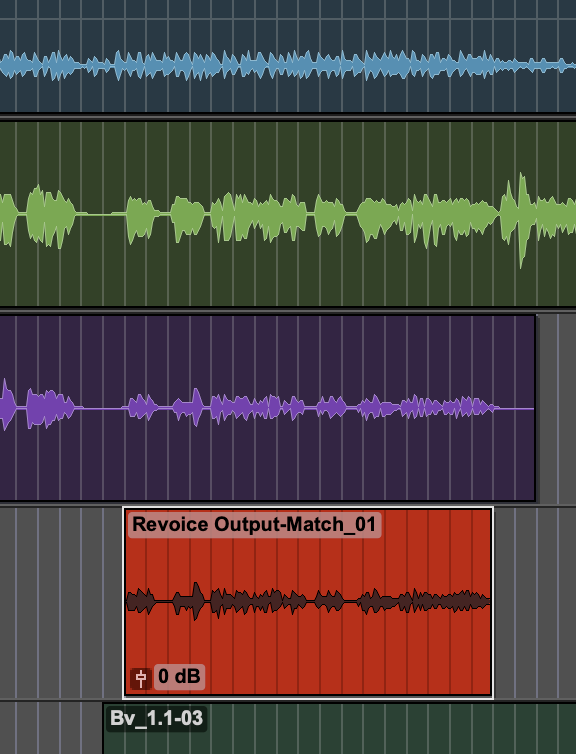We can see the output here below the Guide and Dub track as the red audio region titled 'Revoice Output-Match_01'