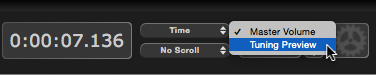 The replay level of the tuning preview can be adjusted using the selector drop-down in the transport area of the main display, as shown below. The master volume control below this affects whichever parameter is selected in the drop-down (master volume or tuning preview).