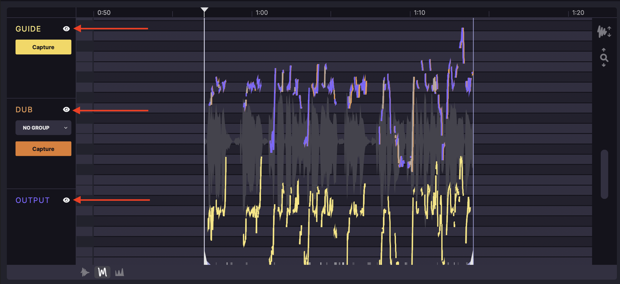The Output appears in the bottom of the three default waveform views, as a solid purple waveform overlaid with a yellow outline of the Guide waveform to show time alignment of the Output relative to the Guide.
