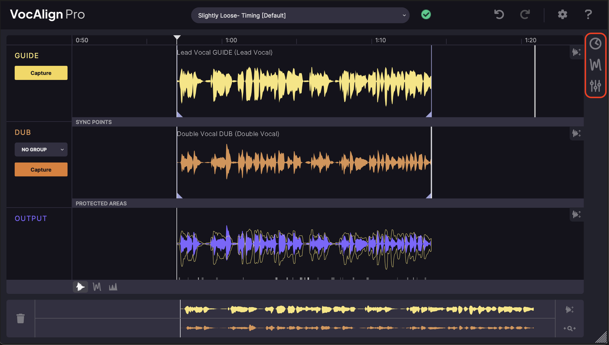 VocAlign 6 Pro has three control panels than can be opened and closed using the buttons found on the right hand side of the user interface. They are circled in red in the below image.