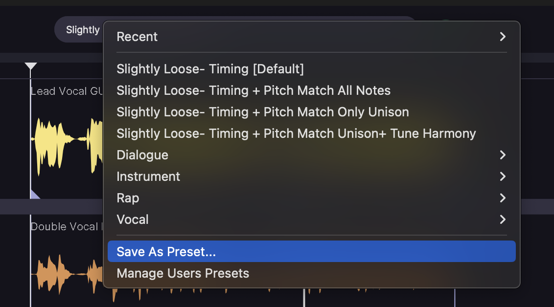 To save all the current VocAlign 6 Pro control settings as a new preset, click the preset menu and select Save As Preset, then give your preset a name and click Save.