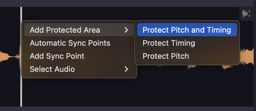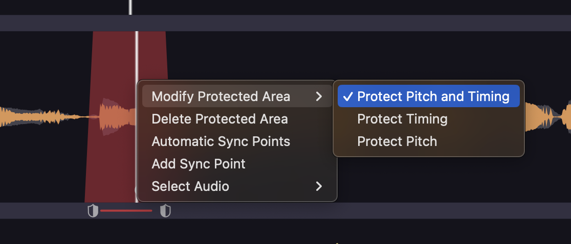 You can also create a Protected Area by right-clicking the Dub and selecting Add Protected Area > Protect Pitch and Timing, Protect Pitch or Protect Timing.