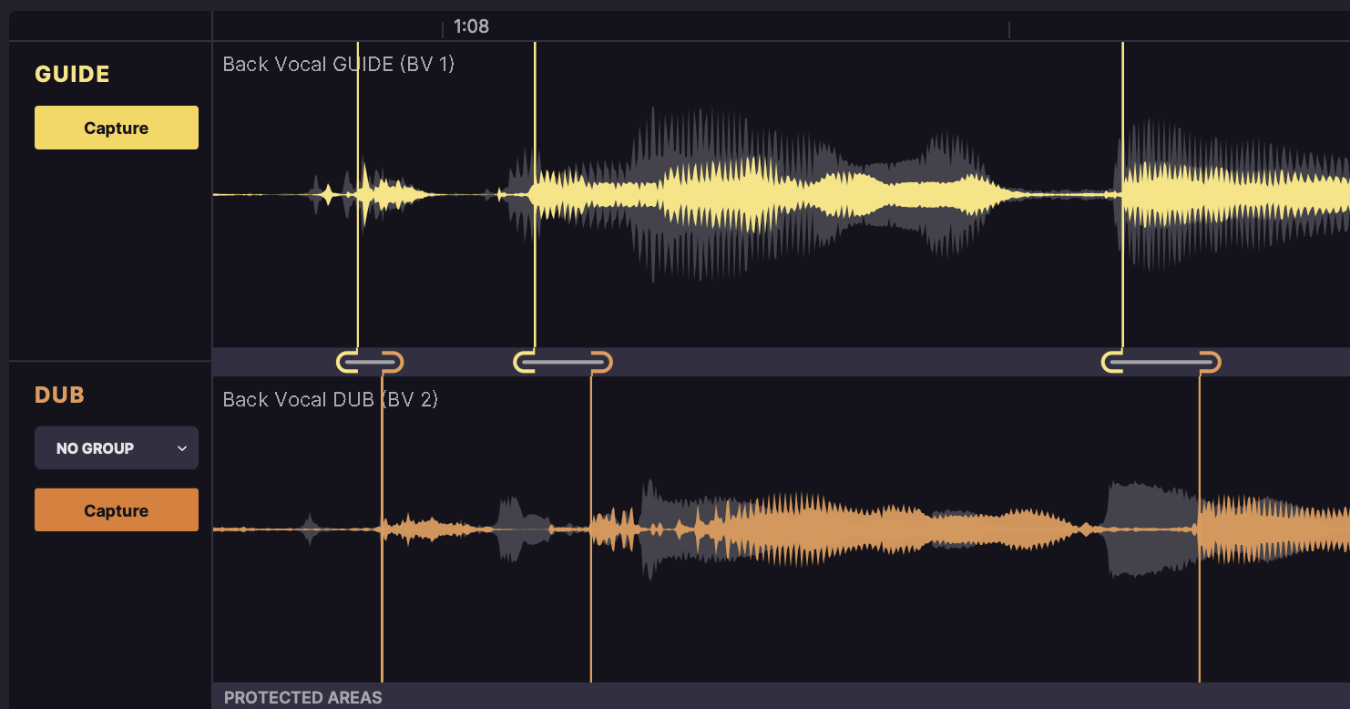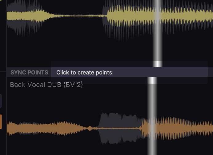 A pair of connected Sync Point markers will appear in the Guide (yellow) and Dub (orange). Drag each one to the position in their corresponding signal that you want to align to try and ‘pin’ the Sync Point in the Dub to its paired Sync Point in the Guide, intelligently stretching and compressing the Dub on either side to maintain alignment.