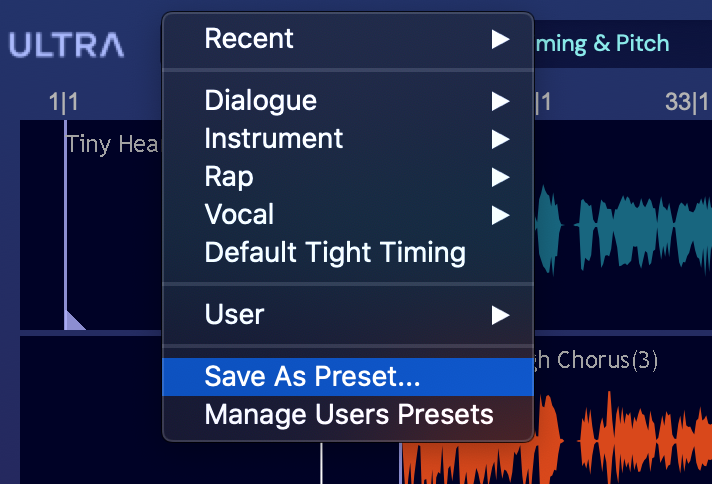 A VocAlign Ultra preset is really just one particular configuration of all its parameters, made to help you complete a specific music or post-production task. The factory presets should be useful as starting points for most cases.