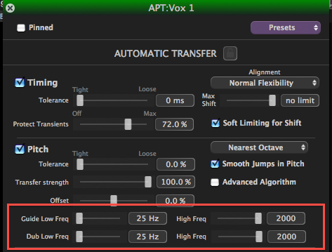 As shown inside the red highlight in the image above, for both the Guide and Dub signals, the lowest frequency the pitch detectors can be set to is 25 Hz and the highest frequency is 2000 Hz. Normally, only the low or high limits would be adjusted for a particular signal's range. For the manual pitch adjusting "trick", set both the Guide and Dub to the same limits.