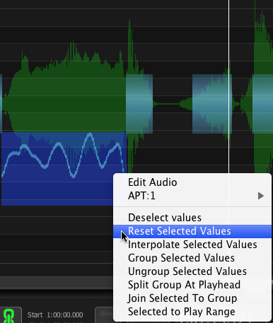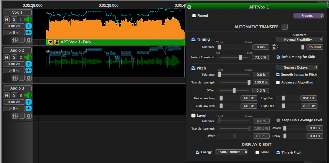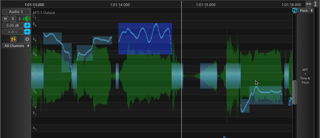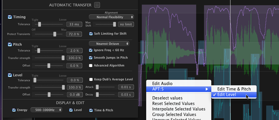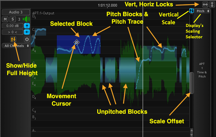 In this example, to keep the discussion more simple, in the Display & Edit section of this processes' APT Control Panel (not shown here), only the Time & Pitch selector has been turned ON, and Level is OFF.