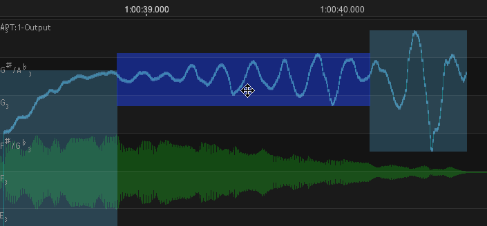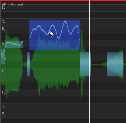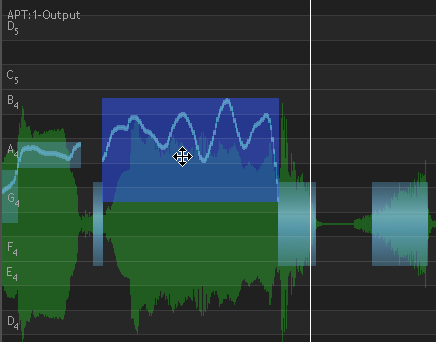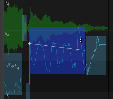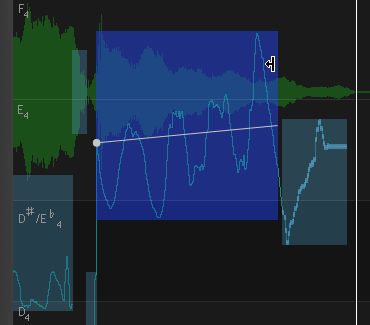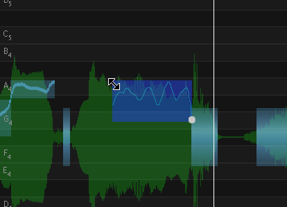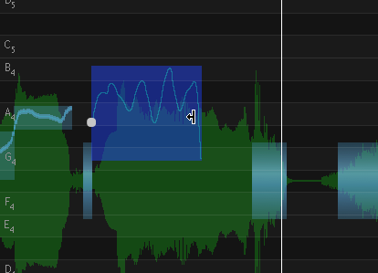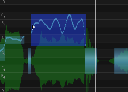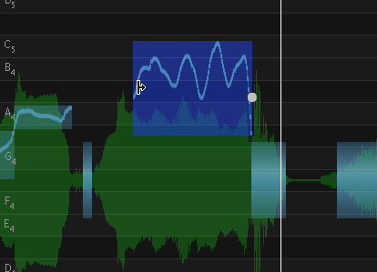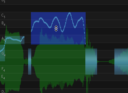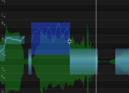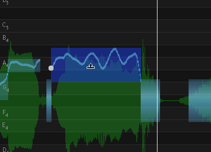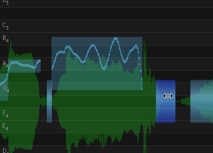 The pitch blocks (shown in blue) behave like a position dependant tool selection menu. In other words, as you move the mouse cursor around or in the block, the cursor will change shape to show you what "tool" can be used to modify the signal and in which directions the block can be manipulated.
