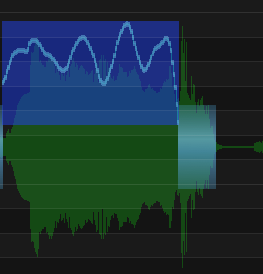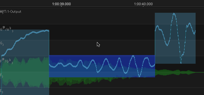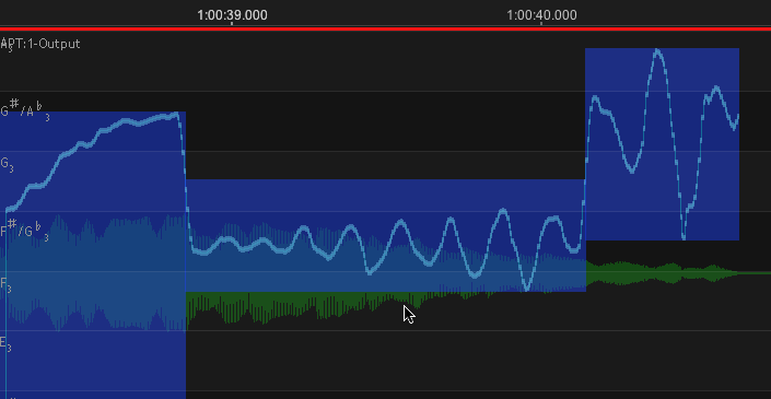 Where the audio signal has a measurable Pitch, (as shown above) the pitch measurement traces are automatically Grouped inside Pitch Blocks, which are generally like single "notes" around an average pitch for a duration determined using the pitch group's trajectory.