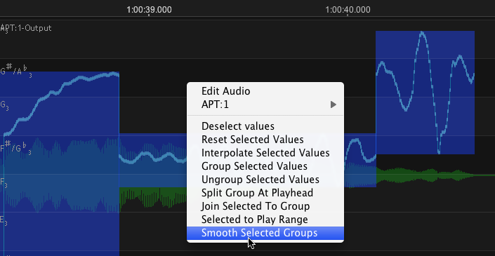 Sometimes a fast pitch change is created between blocks of pitch groups (for example by moving a block up or down). A smoothing function can quickly fix this.