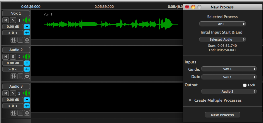 - Set both the Guide and Dub Inputs, to be the same track that contains the waveform requiring adjustment, which is "Vox 1" in the example New Process window above. Then, set the Output track. ("Audio 2" is selected in the example above).