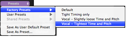 - If not already set, open the APT Control Panel and either load the Factory Preset "Vocal - Tightest Time and Pitch" as show in image directly below, or simply set the APT Tolerance controls for Time, Pitch (and Level) to 0 in the as in the image after next.