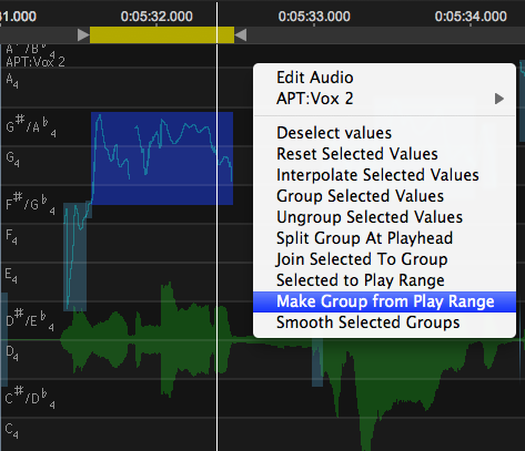 As shown right, create a Playback range (yellow bar at the top) that is the length of the signal section where you want to group the pitch measurements together. Then RIGHT CLICK in the output track and select Make Group from Play Range.- Select one pitch value with the mouse cursor, holding SHIFT key down, moving the cursor going to last measurement to put in new group, RIGHT CLICK and select Group Selected Values.