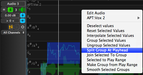 An interesting feature of Revoice Pro is that Groups or values of pitch can be copied [using CMD C (Mac) / Ctrl C (Windows)] for example from one Pitch Block to another Pitch Block [using CMD V (Mac) / Ctrl V (Windows)].