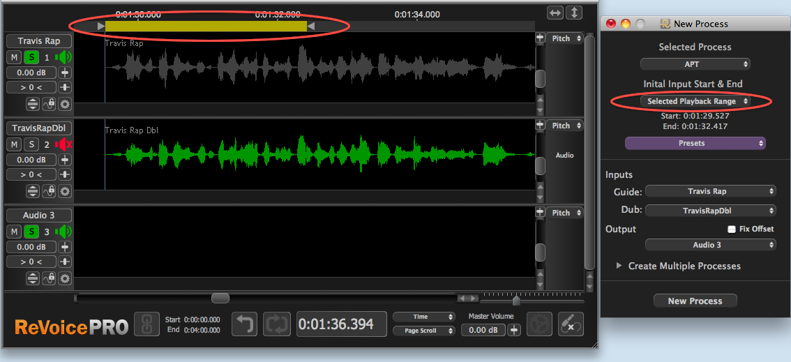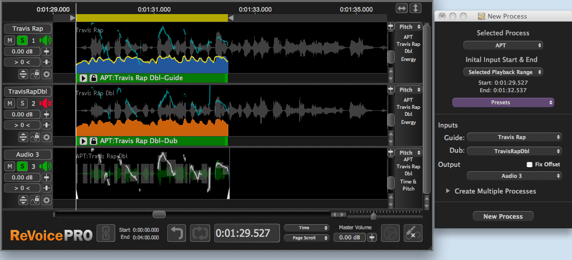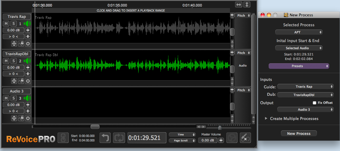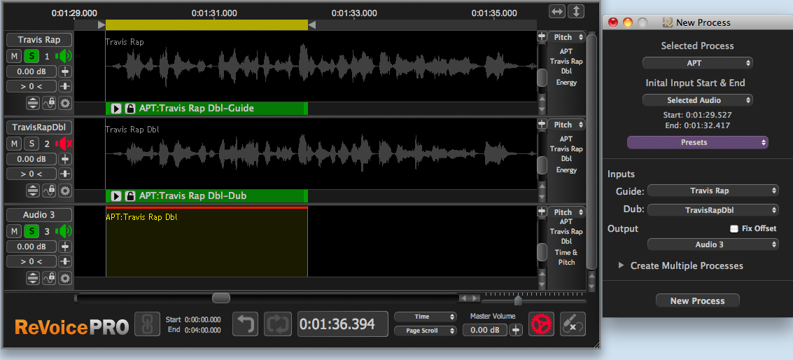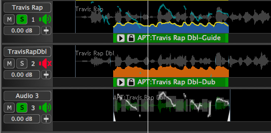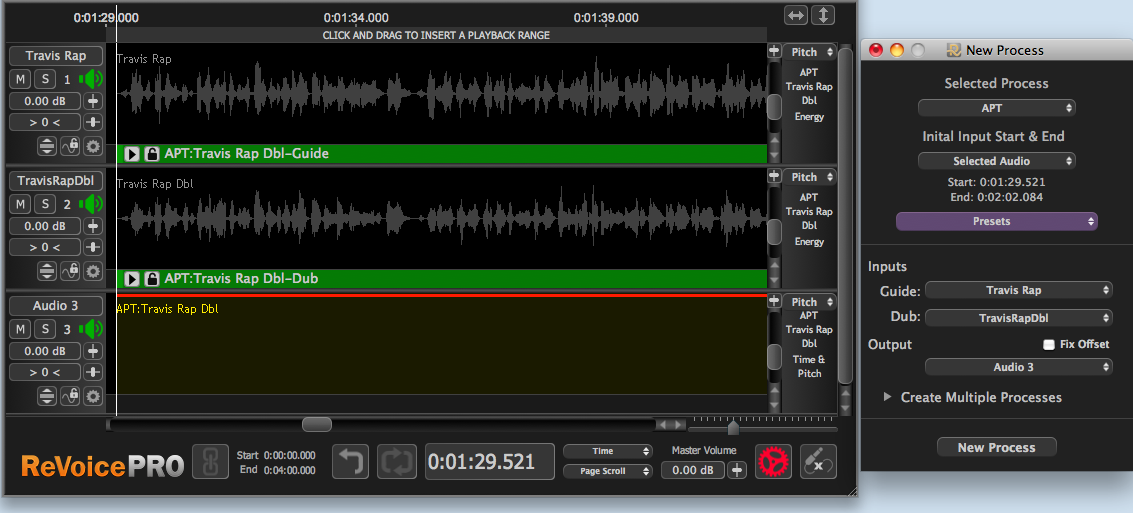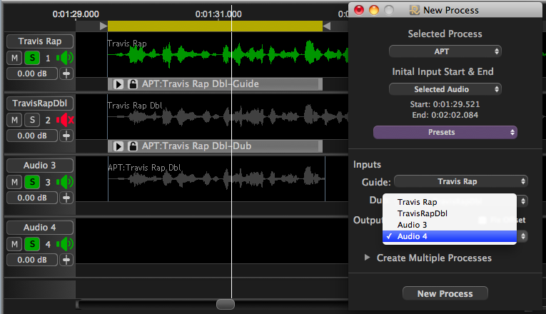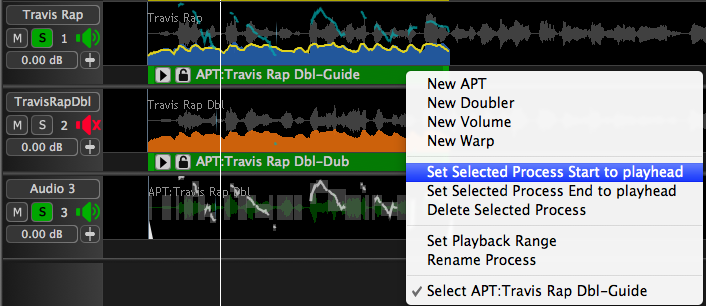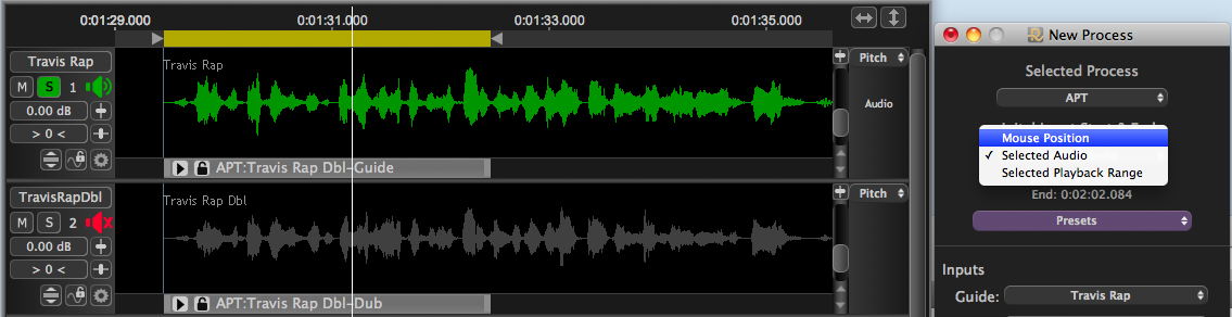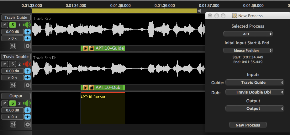 In this example, creating the New Process will insert the green (selected) Guide and Dub Process Control Blocks (shown in the picture below with names APT:Travis Rap Dbl-Guide and APT:Travis Rap Dbl-Dub) into the Process Control Tracks (below each corresponding audio waveform). These Blocks show where the processing will start and end for each input signal.