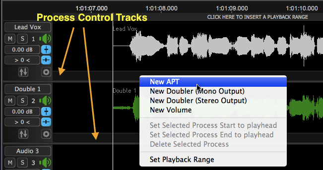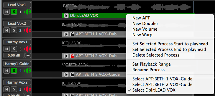 RIGHT CLICKing a Process Control Track (in this example, the Lead Vox) will pop-up a window that displays all the processes that are positioned where the user clicked. Selecting its name from the list will "pop it to the top of the stack" of processes, making it visible on the screen, and show it as selected. In the example shown right, 2 APTs and 1 Doubler use the Guide section shown and the Doubler has been selected and is shown selected in the Process Control Track i.e. at the top of the "stack".- LEFT CLICKing a processes' Output signal waveform will also select and reveal that processes' Input Process Control Block(s) (Guide and Dub for APT or single Input for other processes).