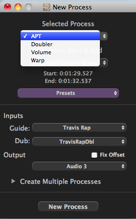 In this section - we approach this by creating the APT and Doubler processes one at a time. However, Revoice Pro provides an Multi-track processing feature which lets you designate several input Dub tracks and corresponding output tracks at the same time. This highly efficient approach is described separately in the Multi-Track Processing chapter.