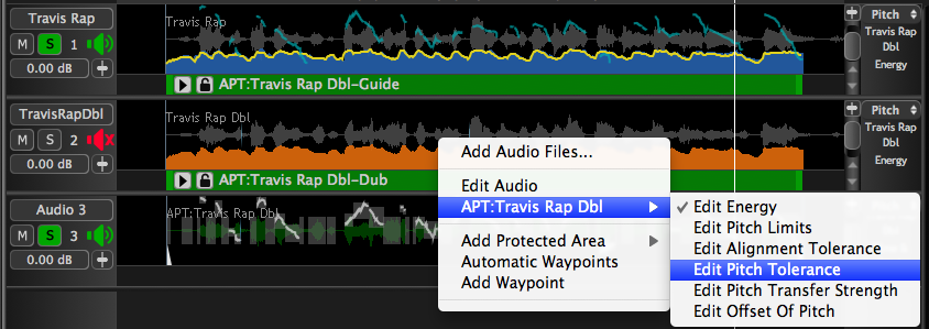 You must first access the "trace" showing the setting value (which initially will be set to the control panel value and therefore constant along the timeline for the duration of the Process Control Blocks). In the picture below, we have RIGHT CLICKed in the Dub track of the APT process and the first pop-up menu shows this to be "APT:Travis Rap dbl". We then have another pop up menu showing the selection of Pitch Processing Settings: