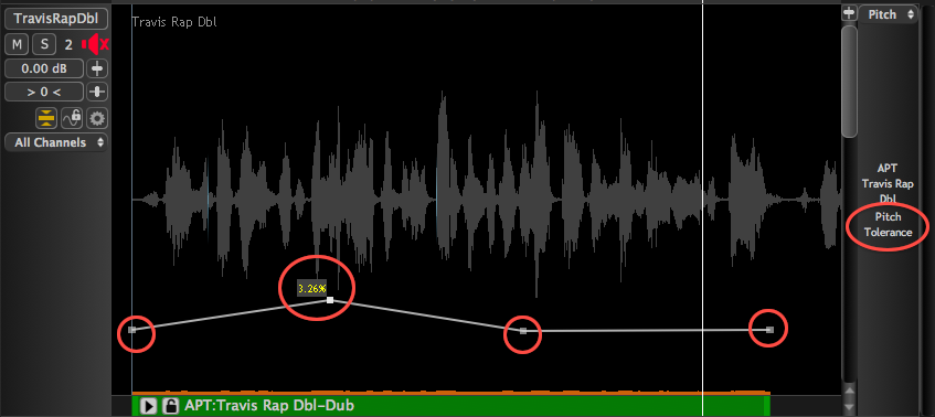 In this example, we have selected the Pitch Tolerance setting, which in the APT controls is at 2% and then opened the Dub track to full height in the picture below. Then, we have grabbed points with the mouse along the original horizontal line between the end points and dragged them vertically. The larger circled point shows we have changed the value to raised their value to 3.26%. At the right, we have also circled where the program will show the name of the setting being modified in that track.