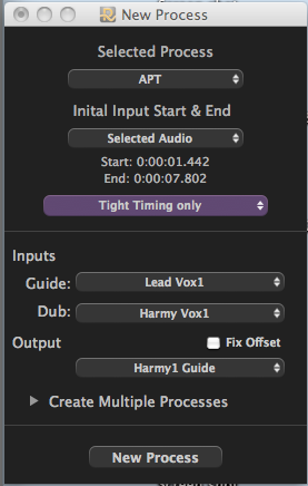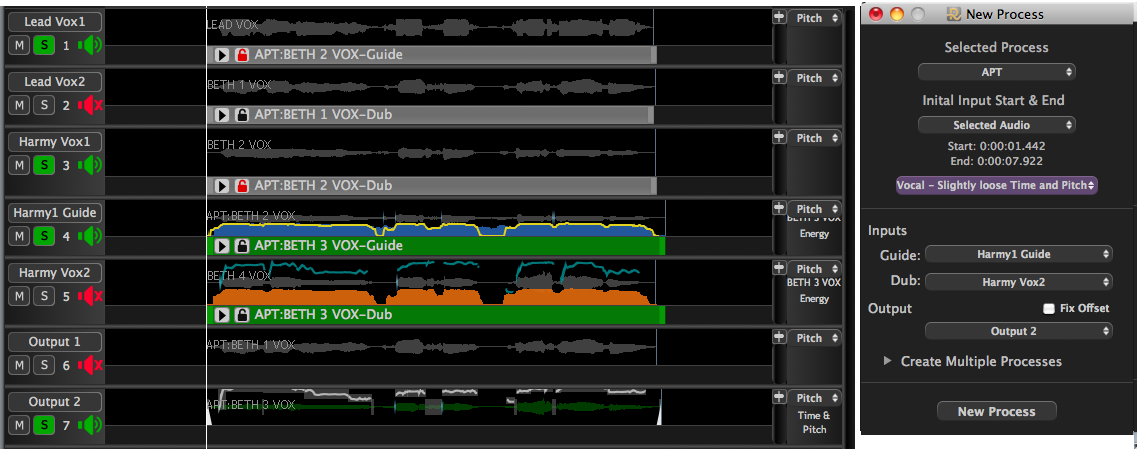 Now we use the adjusted "Harmy1 Guide" as the Guide input to a new APT process with the Dub being "Harmy Voc2" track and the Output going to "Output 2" as shown in the picture below.