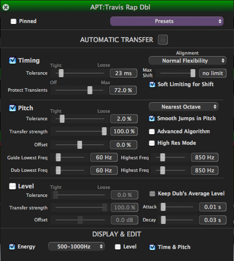 - Time-variable Pitch transfer parameters can be graphically adjusted along the timeline to vary APT's pitch tightness, pitch offset and pitch transfer strength.