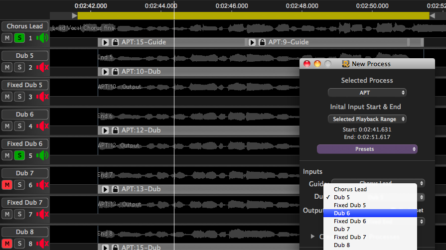 1) Load the entire Guide and Dub tracks, and use carefully positioned APT Process Control Blocks to process phrases or segments of the Dub and Guide together and output the processed audio as you go. This also allows you to set the Start and Ends of Guide and Dub APT Inputs to be different as required, as explained in detail in the rest of this chapter.