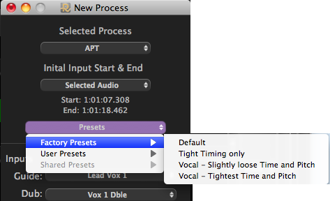 We will create first APT using Lead Vox1 and Lead Vox2 as inputs and Output 1 as output. We should check we have the correct Preset instead of the User Default. In the picture below, we are selecting the Preset "Vocal - Slightly Loose Time and Pitch". Press N and Spacebar to create the 1st APT Output in Output 1.