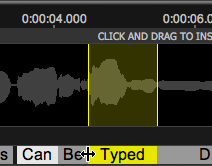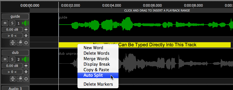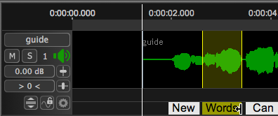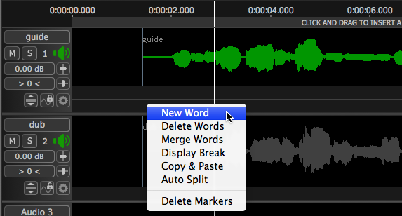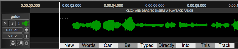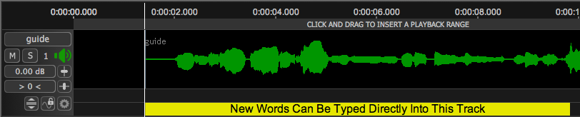 If New Word is selected, an area will be reserved at the location of the Playhead and the user can type directly into that track. (Here the words "New Words Can Be Typed Directly Into This Track" have been entered.)