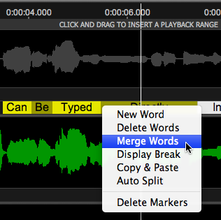 The selected block is shown in yellow and the edges of words can be dragged either direction to make the start and/or stop coincide with the related audio, as shown below.