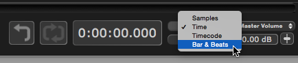Using the upper drop-down to the right of the current time display in the transport area of the main display, select Bars & Beats. This sets the timing units of the horizontal scale above an audio track.