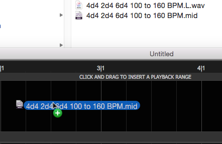 In the picture below you will see the bar/beat grid of the imported MIDI file against an audio click track that conforms to the same pattern. The tempo varies from 100 to 160 BPM up to bar 13.