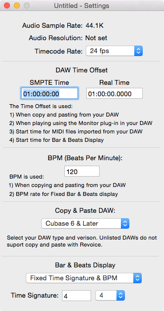 Enter the time at which you want the bars and beats count to begin, either in the SMPTE or Real Time box under DAW Time Offset, and press Return or Tab. This should normally match the start time of the related audio. Enter the number of Beats Per Minute in the BPM box. Select Fixed Time Signature & BPM in the Bars and Beats Display drop-down at the bottom, and choose a Time Signature to match your music. Close the Settings window, and you should now see a fine grid on the audio track, with bar/beat numbers along the top edge, as shown below. The bar lines are shown stronger than the beats.