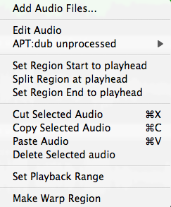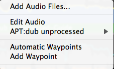 If an APT or Doubler Process uses the selected audio waveform, the menu will have two additional options below "Add Audio Files...". The menu displays as shown right if audio is already selected (waveform is green), or if neither the audio or process is selected (both grey). If the process is currently selected (process bar is green) the menu displays as shown in the section below (Mac OS).