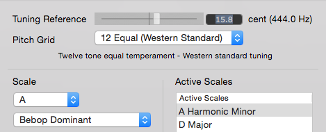 If you need to work to a tuning reference other than A4=440 Hz, you can alter this using the Tuning Reference slider at the top of the Scales dialog. In this example the tuning reference has been altered to 444 Hz, which is used by some European orchestras, for example. The tuning shift is also shown in cents, in this case +15.8 (a cent being one hundredth of a semitone). The range is up to a semitone up or down from standard concert pitch.