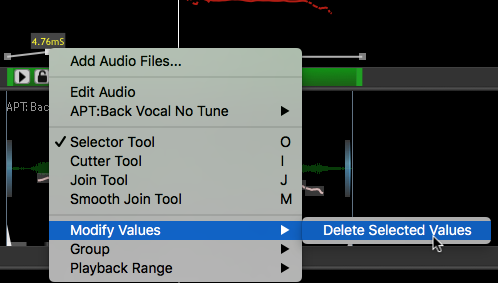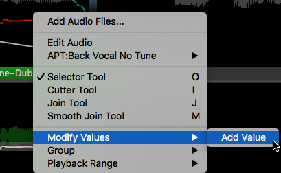 Alternatively, points can be added by RIGHT CLICKing anywhere in the audio track concerned and selecting Modify Values > Add Value from the contextual menu, as shown below.