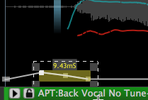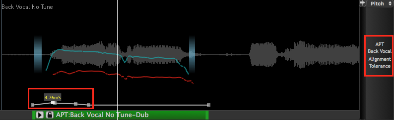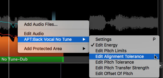In the picture above, we have RIGHT CLICKed in the Dub track of the APT process and in the first contextual menu selected the APT Process "APT:Back Vocal No Tune". Edit Alignment Tolerance has then been selected from the right-hand contextual menu (this controls the time alignment tolerance value also set in the APT Control Panel.)